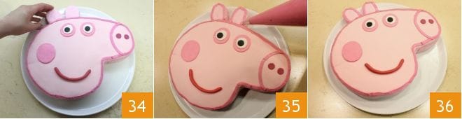 Place the ears close to Peppa Pig's head 34 and decorate them with royal icing 35 as for the rest of the snout. Your Peppa Pig cake is ready to be devoured 36!