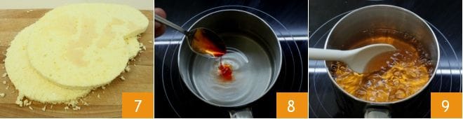 Also, divide the template 7; separately, prepare the syrup: in a saucepan, bring the water, sugar, and a few drops of mandarin flavor to a boil, stirring with a wooden spoon (8-9).