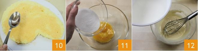 With the syrup, moisten all the layers of sponge cake. Then prepare the Pastry cream: in a saucepan, heat the milk (keeping about half a cup aside) with the seeds from the vanilla bean; bring everything to a gentle boil, then remove the saucepan from the heat and let the vanilla steep in the milk for about 10 minutes. In a separate bowl, work the yolks with the sugar 11 using an electric beater to obtain a frothy and whitish cream; continuing to beat, slowly pour in a third of the warm milk from the saucepan 12. At this point, incorporate the sifted flour, adding it gradually. Remove the vanilla bean left in the milk and pour the egg, flour, sugar, and milk mixture back into the same saucepan.