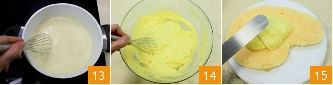 Put everything back on the heat and bring to a boil, stirring frequently 13; let it simmer over low heat for a few minutes to thicken, continuously beating with the whisk to prevent lumps from forming. Now take the half cup of cold milk set aside and slowly add it to the custard cream, stirring occasionally. Turn off the heat and let cool, covering the cream with plastic wrap in contact. When it is cool, mix with a whisk 14 then spread it on one layer of sponge cake 15.