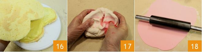Perfectly match the other sponge cake disc over the cream layer 16, then brush the surface with apricot jam. Then focus on the Sugar paste: soak the gelatin in cold water to soften it; heat the glucose (or honey) in a thick-bottomed saucepan together with the water, without bringing it to a boil; squeeze the gelatin and add it to the syrup with the glucose. Now sift the powdered sugar into a bowl and add the glucose and glycerin, kneading until completely absorbed. Transfer the mixture to a work surface dusted with powdered sugar and continue working it until smooth and uniform and no longer sticky. At this point, using disposable gloves, color 2/3 of the sugar paste with pink colorant 17; work the dough until the colorant is absorbed and the color is uniform; roll out the pink sugar paste thinly with a rolling pin 18.