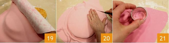 Place it on the Peppa Pig template with the help of the rolling pin 19 (for this operation, you can consult the guide: how to cover a cake with sugar paste); make the edges and surface adhere perfectly, then cut and keep the excess parts 20. Keep a small piece of white sugar paste for the eyes; add more colorant on a portion of sugar paste to make the cheek and the base of the eyes a bright pink color: you can get the cheek by making a disc with a small knife while for the base of the eyes, use a 1.5-inch diameter round cutter 21.