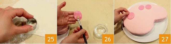 Color another piece of sugar paste red and form a thin roll for Peppa Pig's mouth. With the remaining white sugar paste, cut the whites of the eyes with a 1.2-inch diameter round cutter 25; now brush all parts with sugar paste with some water 26 and start assembling the face: adhere the base of the eyes and Peppa Pig's cheek 27.
