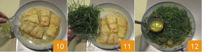 Brown them for 2 minutes on each side, then deglaze with white wine 10, allowing it to evaporate. Once the alcohol has evaporated, add the agretti 11 and pour in the vegetable broth 12.