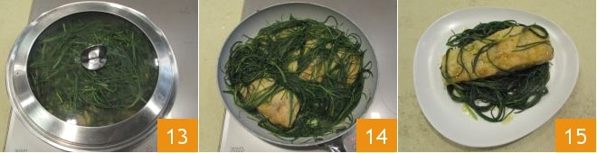Cover with a lid 13 and cook for 7-8 minutes over medium heat, checking occasionally. Once cooking is complete 14, salt and pepper to taste, and serve your perch fillet immediately on a bed of agretti 15.