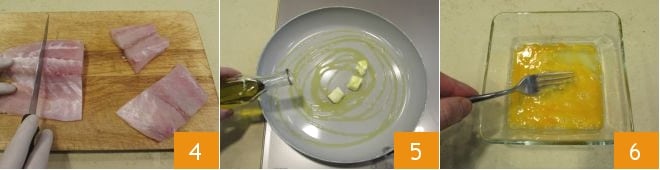 Now take care of the perch: take the fillet, run your hand over the surface to check for any bones, and remove them with kitchen tweezers. Cut the fillet into pieces 4, then in a large pan, melt the olive oil with the butter over very low heat 5, then add a clove of garlic, peeled and halved, to flavor; meanwhile, coat the perch pieces in flour: in a bowl, beat the eggs 6, add salt and pepper. In another large, shallow bowl, pour the flour