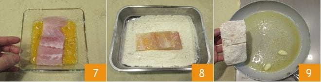 then coat one piece of perch at a time, on both sides, first in the egg 7, then in the flour, ensuring it adheres well over the entire surface 8. Once the oil and butter begin to sizzle gently, add the floured fillets to the pan 9