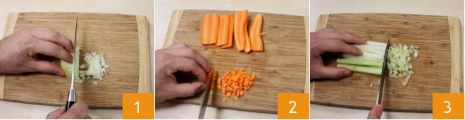 To prepare perch fish risotto, start with the fish stock, using the perch fish scraps. Once ready, proceed with the preparation of the sauté. Wash and peel the carrots, onion, and celery, then chop them finely with a knife (1-2-3).