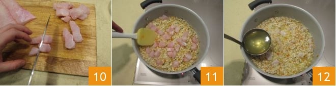 In the meantime, cut the perch fish into 0.2-inch pieces 10. Halfway through cooking, add half of the fish to the rice 11; continue cooking with the stock, lightly salting and peppering 12.
