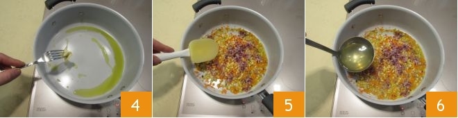 Heat the oil in a fairly large pan with the garlic clove, and as soon as it is browned, remove it with the help of a fork 4. Then add the finely chopped vegetables, stir 5, and let them stew for a few minutes adding a ladle of stock 6.