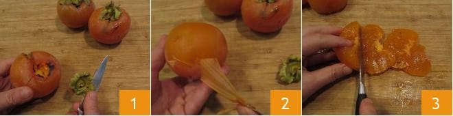 To prepare the persimmon cake, wash the fruits, cut off the stem 1 and remove the peel 2, slice them roughly 3 and set aside.