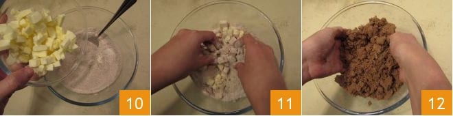 Add the butter into the bowl as well 10, work the dough with your fingertips quickly 11 to obtain crumbs 12.