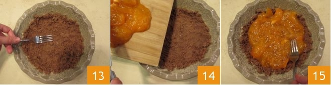 Butter a 10-inch diameter cake pan and sprinkle the bottom and edge with brown sugar. Pour half of the dough and level it on the bottom with a fork 13. Now pour the persimmons 14 and distribute them with the fork or a spoon to create an even filling layer 15.