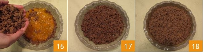 Now pour the other half of the dough 16 to completely cover the filling 17. Bake the cake in a preheated static oven at 356°F for 40 minutes. Once baked, take the persimmon cake out of the oven, let it cool before serving, dusting the surface with raw cocoa 18.