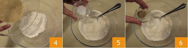 Now take care of the dough: pour the sifted flour into a large bowl, add the brown sugar 4, fleur de sel 5, and ground cardamom 6.