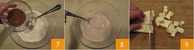 Add also the raw cocoa 7 and stir to mix the powders 8. Cut the cold butter into cubes 9.