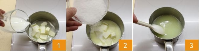To make petit beurre, place the butter, milk 1, and sugar 2 in a saucepan, and melt everything over low heat, stirring with a spoon 3, then let it cool.