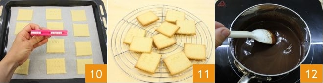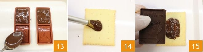 Pour the melted chocolate into rectangular silicone molds the same size as the cookies 13 and set aside a couple of tablespoons to help the chocolate adhere to the cookie. Let the molds firm up in the refrigerator for at least 30 minutes or until solid. Remove the chocolate molds and attach them to the cookie by brushing the surface with the melted chocolate (14-15). Now you can finally enjoy your homemade petit beurre!