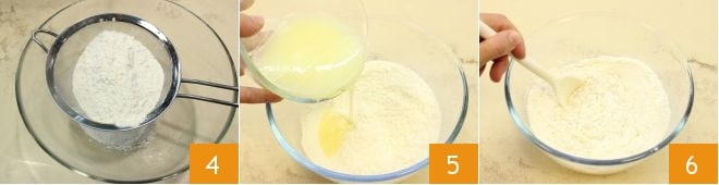 In a bowl, sift the flour and baking powder 4, add the melted butter and milk mixture to the dry ingredients 5, and mix with a spoon to combine the powders 6. When you have obtained a homogeneous dough,