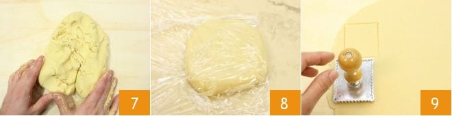 transfer it to a floured work surface and knead it quickly with your hands 7 to form a dough ball. It will be very soft, cover it with plastic wrap 8 and place it in the refrigerator to firm up for at least 4 hours. The dough is very soft and needs time to harden. After the resting time, take the dough and roll it out with a rolling pin on a floured surface to create a sheet about 1/8 inch thick, using a wavy-edged rectangular cookie cutter measuring approximately 2.36x2 inches 9.