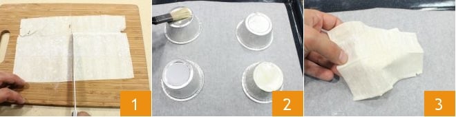 To make the phyllo baskets with salmon and zucchini cream, cut 3 sheets of phyllo dough measuring 9.5X13.5 inches into 4 parts to obtain 4 rectangles 1. On a baking sheet lined with parchment paper, place 4 aluminum molds upside down, grease the bottom and sides with melted butter 2, and place a square of phyllo dough on top 3, moisten it with water