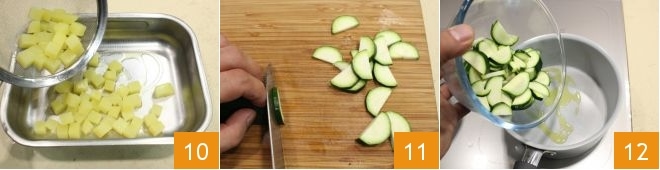 place the rest in a baking dish with a drizzle of olive oil 10 and cook for 10 minutes or until golden (alternatively, you can sauté them in a pan with a drizzle of oil). Wash and trim the zucchini and cut them into thin wedges 11, place them in a small pot with a drizzle of oil 12