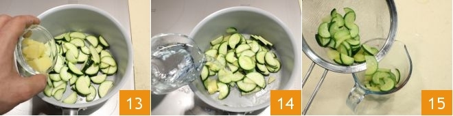 also add the tablespoon of potatoes set aside 13 and sauté for a few seconds, then cover with water 14, bring to a boil and cook for 5 minutes. Drain the vegetables into a tall glass 15
