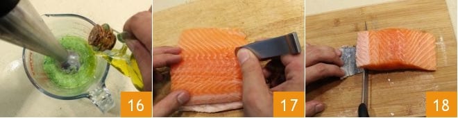 blend them with an immersion blender while slowly adding olive oil 16 until you get a cream to set aside. Prepare the salmon fillet: remove the bones with a special tweezers 17, then remove the skin by separating the flesh with a thin knife 18,