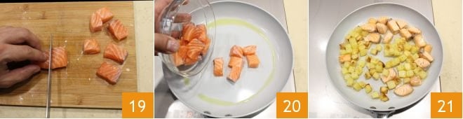 cut the salmon into cubes 19 and heat a drizzle of oil in a pan, then sauté the salmon cubes for a few minutes 20, season with salt, pepper, and thyme leaves, then turn off the heat and add the roasted potatoes 21 (or cooked in the pan).