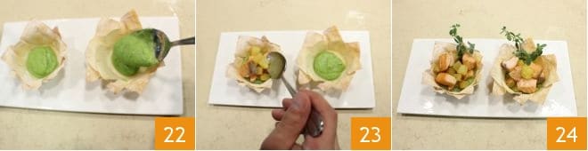 Assemble the baskets: place the baskets on a serving plate and fill with a spoonful of zucchini cream 22 (if you like, you can use a piping bag) and also add the salmon and potato cubes 23. For garnish, decorate the phyllo baskets with salmon and zucchini cream with sprigs of thyme 24.