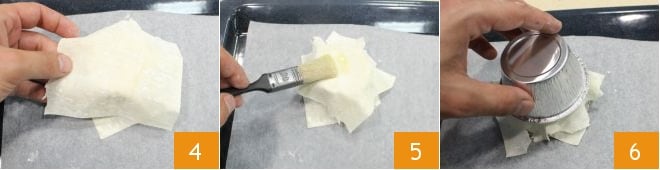 place another square on top 4, the corners should not overlap to create an asymmetrical pattern. Brush the dough again with melted butter 5 and cover with another aluminum mold 6, this way the dough will hold its shape.