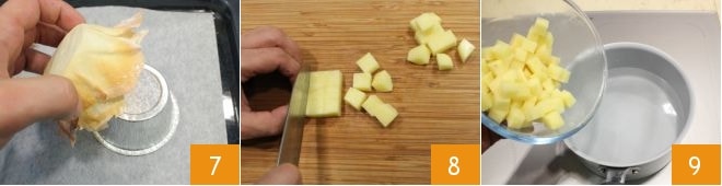 Bake the baskets in a preheated static oven at 374°F for 4 minutes (if using a fan oven, bake at 338°F for about a couple of minutes). Remove the baskets from the oven and let them cool slightly, then remove the aluminum molds 7. Peel the potatoes and cut them into cubes 8, boil them in water for a few minutes 9, then drain them, saving one tablespoon