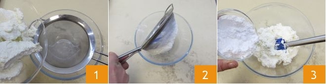 To prepare the phyllo dough cake with ricotta and chocolate, start by making the cream. Pour the ricotta into a strainer 1 and sift it into a bowl 2, then add the powdered sugar 3 and mix to combine everything.