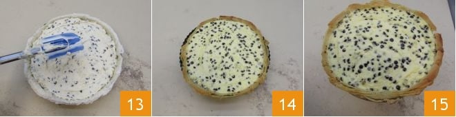 Level the surface with a spatula 13, then bake the cake in a preheated static oven at 356°F for about 45 minutes (check the cooking about ten minutes before, depending on the power of your oven; check when it is nicely golden on the edges). At this point, take out your phyllo dough cake with ricotta and chocolate 14 and let it cool before unmolding and serving it 15!