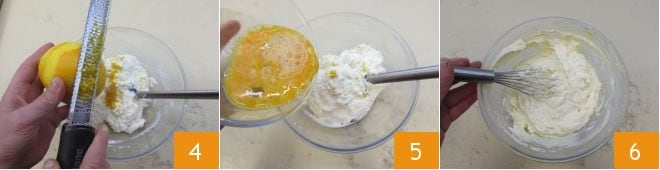 Add also the orange zest 4 and the previously beaten eggs 5, then gently whisk until you get a smooth and homogeneous cream 6.