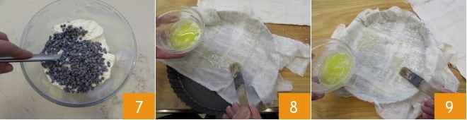 Finally, add the chocolate chips 7, mix once again and set your cream aside. At this point, take the phyllo dough sheets and use them to line a 9-inch pan (measured on the surface; bottom 8.9 inches). Brush with melted butter 8 to adhere the various sheets of dough and continue in this manner 9