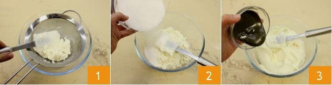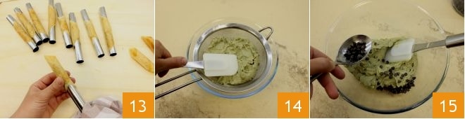 To prepare the pistachio phyllo dough cannoli, start with the filling: sift the ricotta, which you have carefully drained of whey overnight in the refrigerator, using a fine mesh sieve 1. Repeat the process at least twice to make the ricotta creamier and smoother (if the ricotta is too firm, you can thin it out with a little fresh milk or cream), then add the powdered sugar (you can also use granulated sugar) 2 and mix the ingredients. Then add the pistachio paste 3.