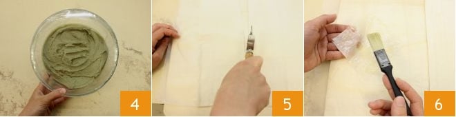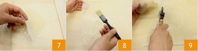 then overlap another sheet 7: brush the second sheet as well 8 and lay a third one. While performing these operations, be careful to cover the other unbrushed phyllo dough sheets with plastic wrap so they don't dry out too much in contact with air. Using a smooth-edged pastry cutter, cut squares about 2 inches per side 9.