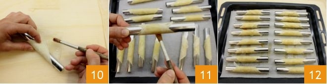 Wrap each square around a cannoli mold, starting from one of the corners and seal the tips by brushing them with a slightly beaten egg white (10-11) (take care not to brush the mold as well, otherwise you will not be able to remove the cannoli after baking). Then place the cannoli on a baking sheet lined with parchment paper 12 and bake them in a preheated static oven at 390°F for about 8-10 minutes (355°F for 5-6 minutes if using a convection oven): phyllo dough cooks very quickly.