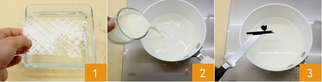 To prepare the phyllo pastry baskets with creamy white chocolate and berry jam, soak the gelatin sheets in a bowl of cold water 1. In a saucepan, pour the milk and cream 2, then slice the vanilla bean lengthwise and scrape out the seeds with a knife; add the seeds and vanilla bean to the milk and cream 3, heating until it reaches a boil.
