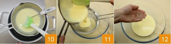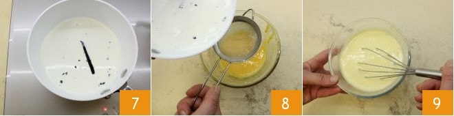 When the milk and cream are about to boil 7, turn off the heat and remove the vanilla bean that you left to infuse. Then, slowly pour the hot milk and cream mixture into the egg mixture, filtering it with a sieve 8 and continue with the beaters to mix the ingredients well 9.