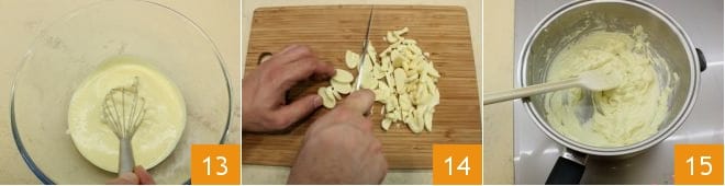 Mix with the beaters until the gelatin has melted 13, then finely chop the white chocolate 14, melting it in a double boiler 15.