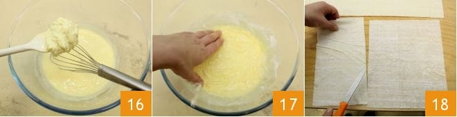 Once the chocolate has melted, add it to the cream, mixing with the beaters 16. When you achieve a smooth and homogeneous consistency, pour the cream you obtained into a container and cover with plastic wrap in contact 17; let it cool at room temperature (to speed up the process, place the cream in a bowl full of ice) and then put it in the refrigerator. When the cream has completely cooled, if you wish, you can pour it into a piping bag without a nozzle, making a hole, always storing it in the refrigerator until using. Meanwhile, prepare the baskets: take 4 phyllo pastry sheets measuring 19x10 inches. With a knife cut 6 equal squares measuring 5 inches 18.