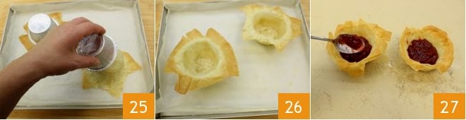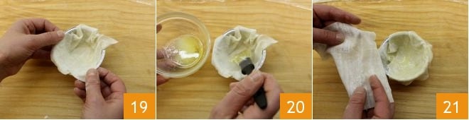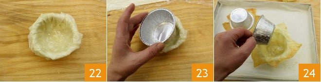 Melt the butter in a saucepan or microwave; line 6 aluminum molds measuring 3.5 inches with one phyllo sheet at a time, pressing it well to adhere to the mold and form a cup 19: remember that phyllo pastry is very delicate, so be careful not to puncture the bottom to avoid leakage during baking. Brush with melted butter between each layer 20 and continue 21: you need to overlap 4 phyllo sheets for each mold; you can decide to fold the corners of the basket or leave them out as decoration.