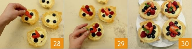 then pour in the creamy white chocolate. Finish by adding the berries to taste 28 and a mint leaf 29; your phyllo pastry baskets with creamy white chocolate and berry jam are ready 30.