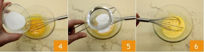 In a separate bowl, beat the 2 egg yolks with the sugar 4 and sifted corn starch 5. Mix with the beaters until the eggs and sugar are well combined 6.