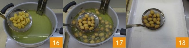 Now you can proceed with cooking, heat the seed oil in a pot to about 340°F, this is the ideal temperature for perfect frying, it's advisable to use a cooking thermometer to monitor precisely. With a slotted spoon, immerse a few morsels at a time 16 so as not to lower the oil temperature. Fry for about 3-4 minutes, then drain the morsels 17 and place them on a tray lined with absorbent paper to dry the excess oil 18.