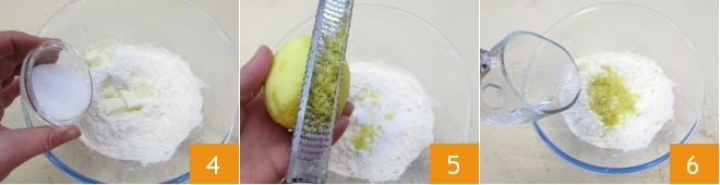 the granulated sugar 4, then flavor with the grated zest of one untreated lemon 5 and the grappa 6.