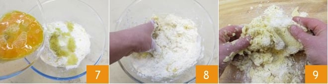 Finally, add the two whole eggs and the yolk 7. Begin kneading by hand vigorously 8 to mix the ingredients, then transfer the dough to a floured surface 9.
