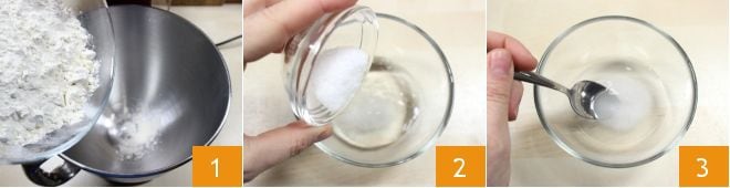 To prepare the pissaladière, start by making the bread dough for the base. Some variations of this recipe involve the use of Puff pastry or Easy Shortcrust Pastry, if you don't have time for leavening, you can try one of these alternatives. Sift the flour into the bowl of a stand mixer or a large bowl if you are working by hand 1. Then pour a splash of water, taken from the total amount, into a small bowl and dissolve the salt in it (2-3).